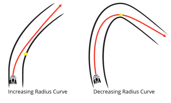 위 그림은 90도의 코너를 보여주고 있다. 같은 90도 코너라고 해도 그 생김새는 각기 다를 수 있다. A, B는는 똑같이 위치해있으나, 코너는 다 다르게 생겼다. 여기서 중요한 것은 래디우스(radius)이다.